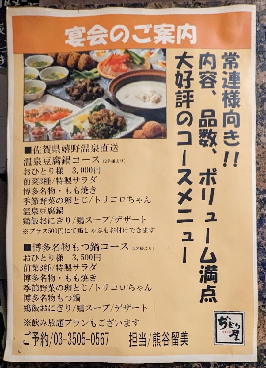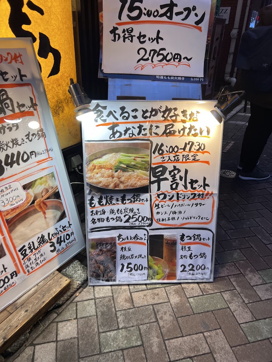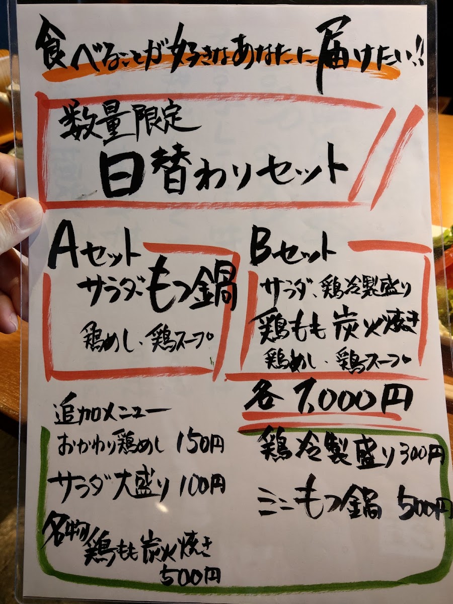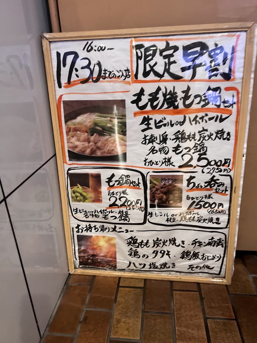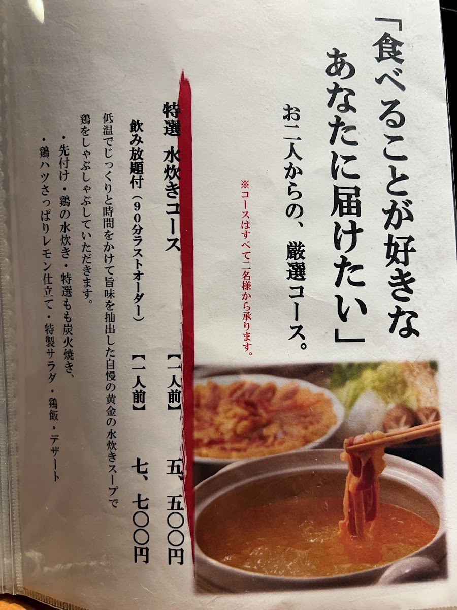 From a reviewer’s perspective, the menu at this restaurant is concise but focused on hearty, traditional specialties, with good value options for early diners and course lovers. The early evening deal, もも焼き・もつ鍋セット at the 早割限定価格, is especially appealing for a casual drink and meal between 16:00 and 17:30, combining grilled chicken thigh with a rich offal hot pot, making it a satisfying and budget-friendly choice. For those looking for a more complete dining experience, the 特選水炊きコース from the ぢどり屋定番コース stands out as a classic selection, highlighting the restaurant’s specialty chicken hot pot in a well-rounded set course. Overall, the menu may not be overly large, but the focus on signature dishes and set courses makes it easy to choose, and the early-bird pricing adds extra value for those who arrive early.